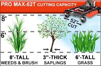 | Our top-of-the-line Tow-Behind, the PRO MAX52T, cuts 52" wide. Its powerful 22 HP V-Twin engine lets you mow up to 2.4 acres per hour and reclaim overgrown property in record time. Take down the thickest growth and make cutting height adjustments on the fly by remote control! |