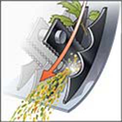 Patent pending. These fins (10) create channels in the bottom of the shredding chamber for the serrated hammers to swing through. They provide additional sharp surfaces to help tear apart yard and garden waste, including the fibrous green branches (up to 1.5” in diameter) that will jam up underpowered machines. |