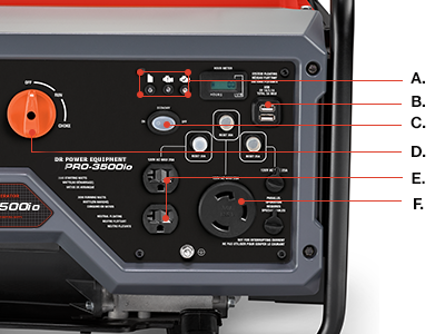 A. GENERATOR STATUS LIGHTS: Power, low-oil, and overload alerts B. (2) 2.1A USB Ports C. ECONOMY MODE: Provides excellent fuel economy and noise reduction D. START DIAL: Choke, run and stop integrated into one easy to use control E. 120V, 20A Duplex Outlet F. 120V, 30A Twistlock Outlet |