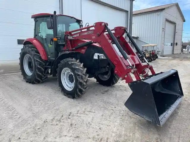 Deluxe cab seat with pneumatic suspension. Handbrake. Front fenders. Wheel weights 4x110 lb with Mid Mt Valve with 3rd function. Case IH HD L630 loader with automatic leveling. Hydraulic bucket attachment; 84" bucket. 2-speed transmission with Power shuttle. 2 auxiliary distributors. Top link of the 3-point hitch. Front tires 12.4x24. Rear tires 18.4x30. No duals.
